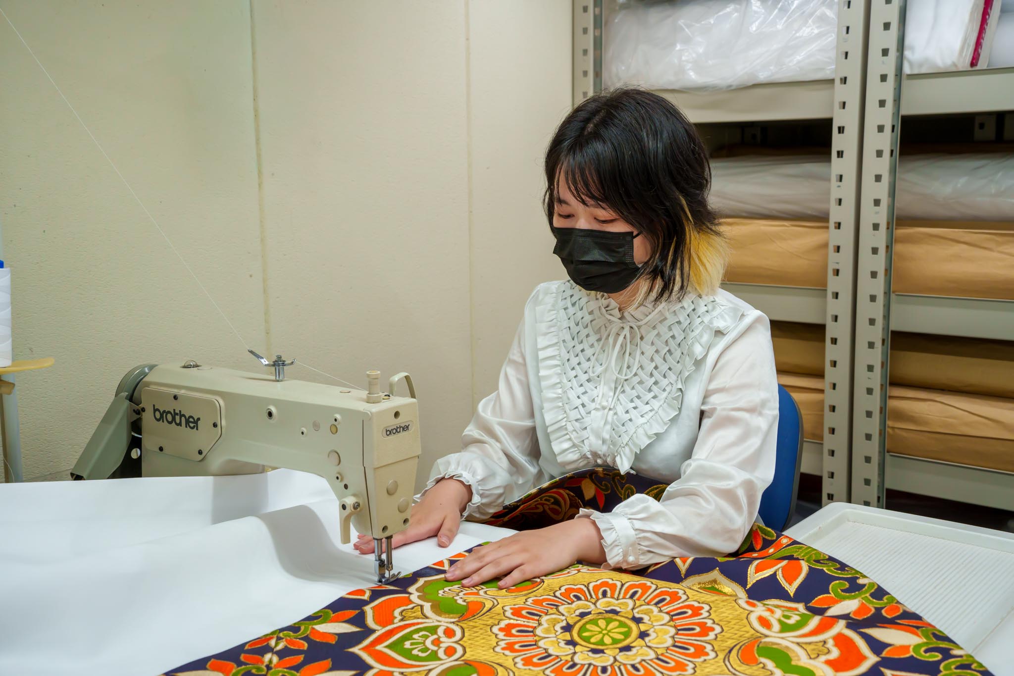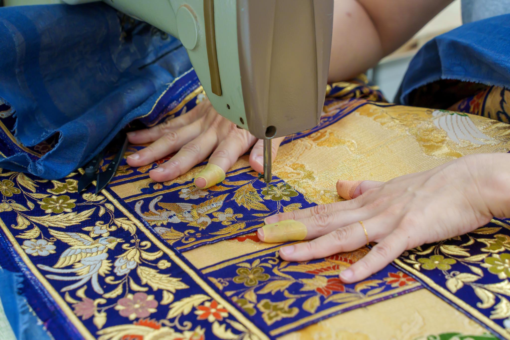 ミシン・洋裁経験のある方でも、普段扱うことのない打敷やお袈裟ですので、不安を感じられるかも知れませんが、丁寧に指導させていただきます。横振りミシンを使って、主におけさの傷みを直します。カラフルな刺繍糸で絵を描くような作業ですので、とても楽しいですよ。打敷の裏地張替や袈裟のお仕立てなど、手縫いの工程も多くあり、やりがいのあるお仕事です。